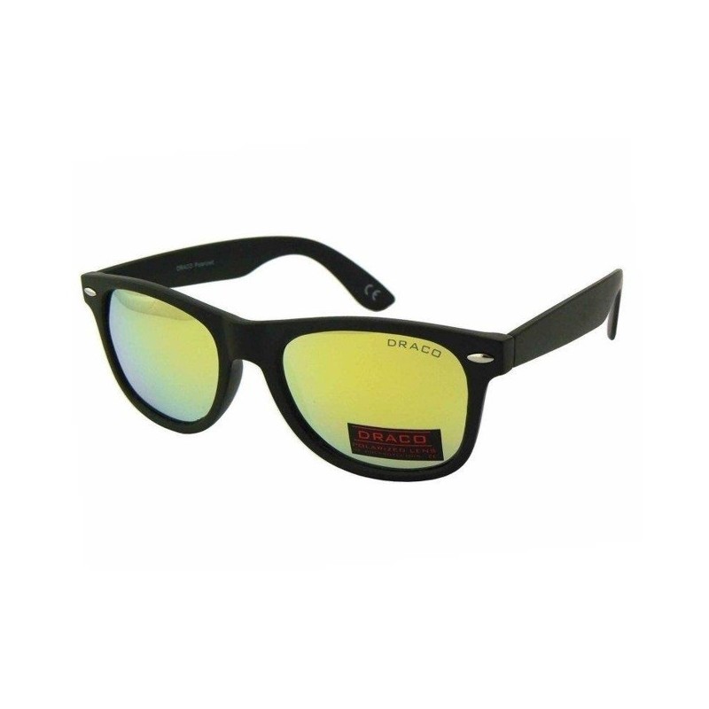 Okulary przeciwsłoneczne polaryzacyjne męskie typu nerdy marki DRACO. Oprawki w kolorze czarnym matowym, soczewki żółte lustrzanki.