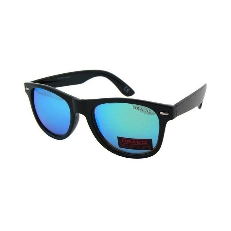 Okulary przeciwsłoneczne polaryzacyjne męskie typu nerdy marki DRACO. Oprawki w kolorze czarnym matowym, soczewki niebieskie lustrzanki.