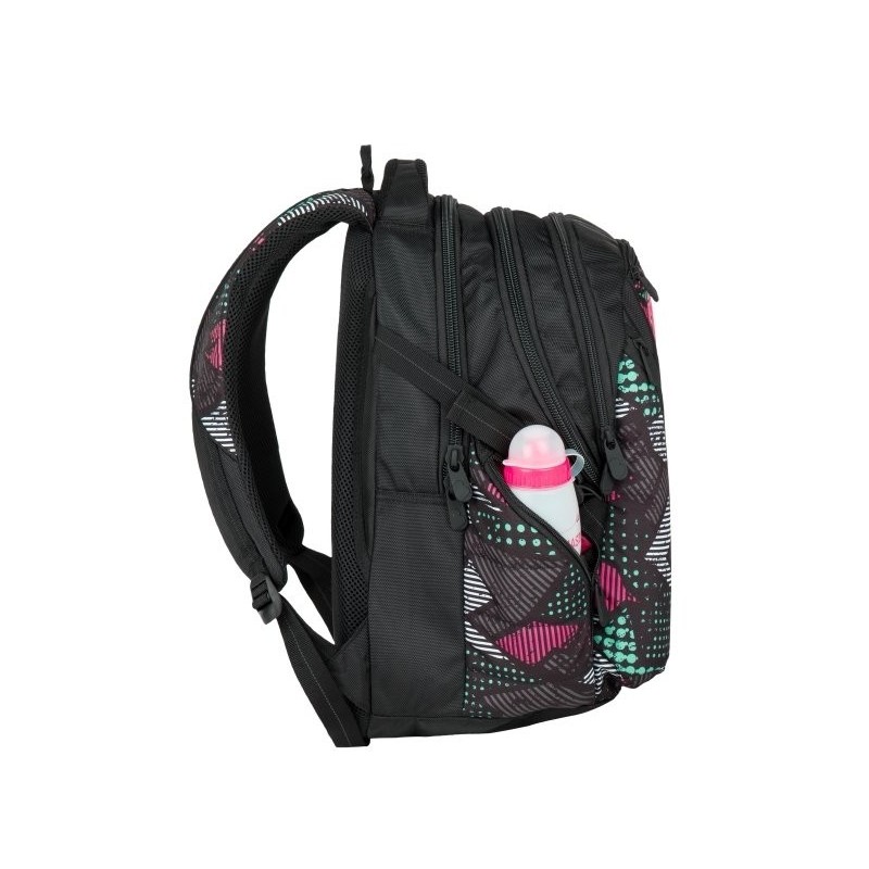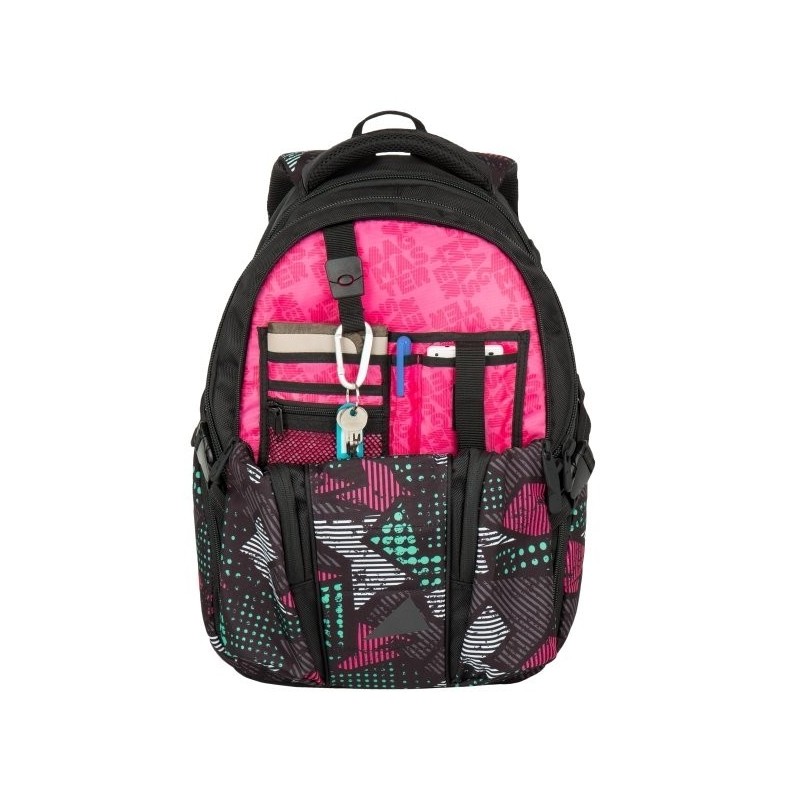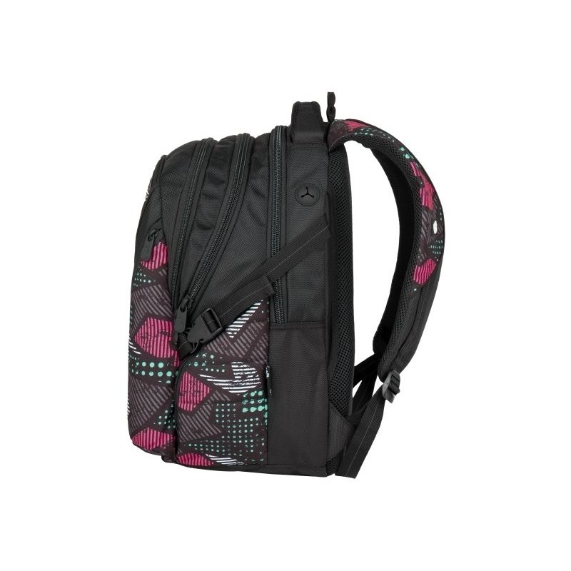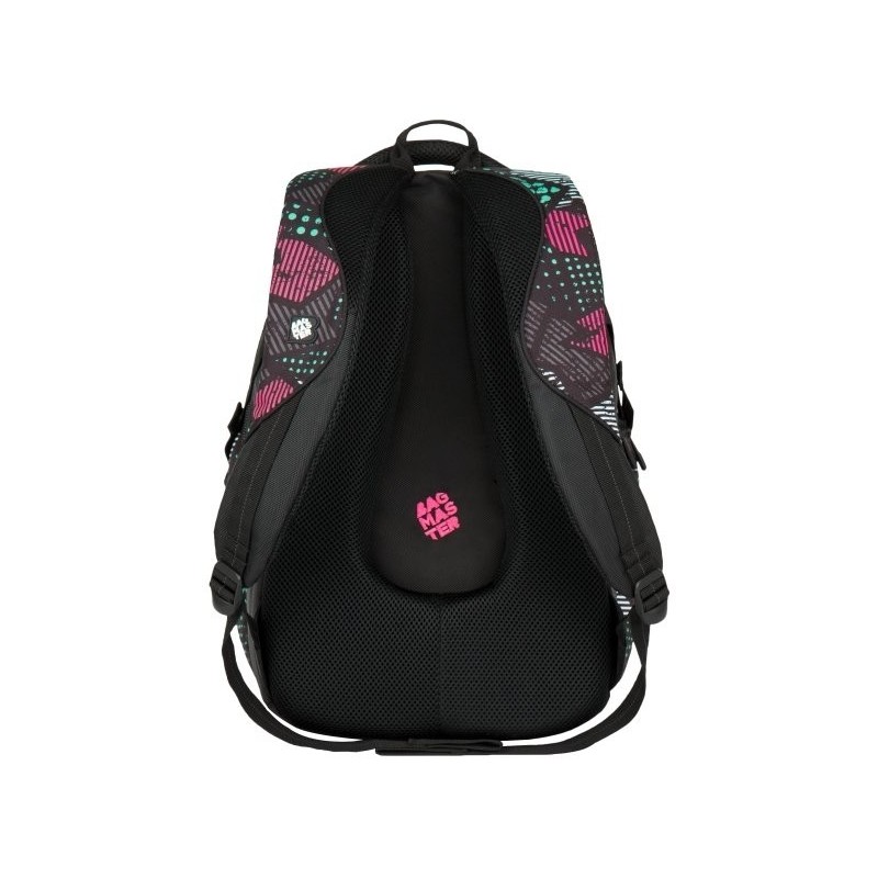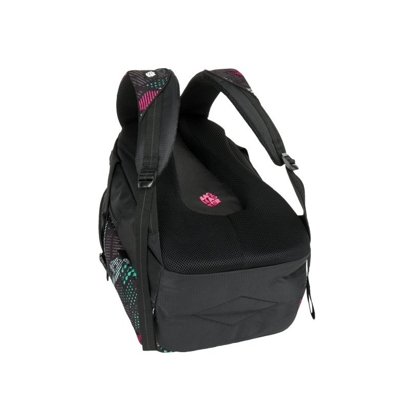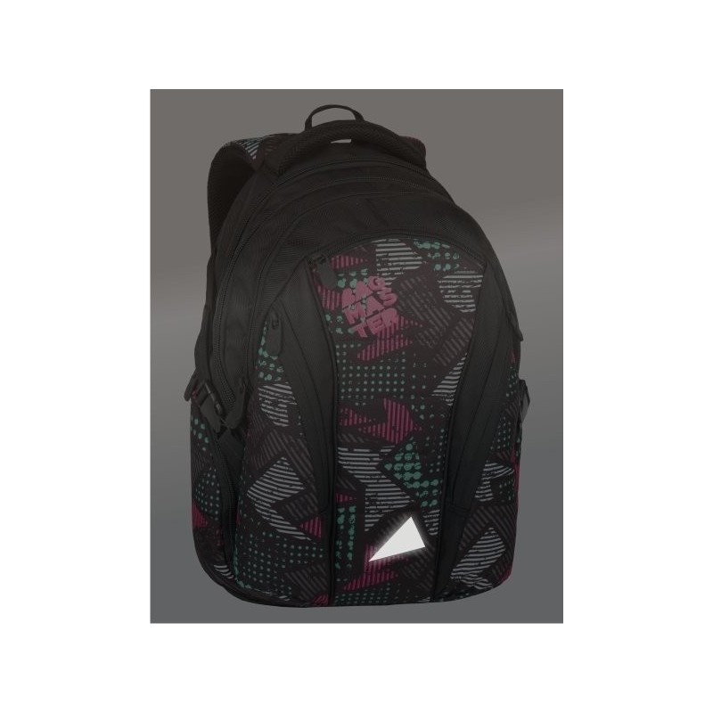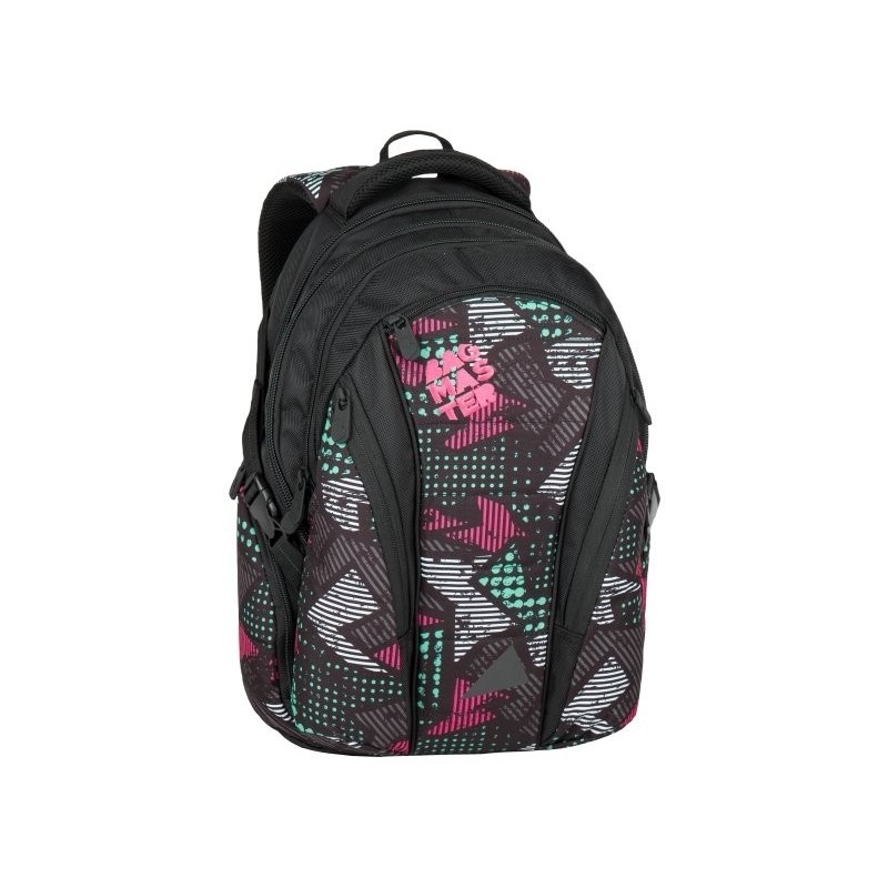 Trzykomorowy plecak młodzieżowy firmy Bagmaster czarny z kieszeniami w kolorowe wzorki. Polecany szczególnie dla gimnazjalistów, licealistów oraz studentów jako plecak do szkoły, na wycieczki, czy jako plecak sportowy.