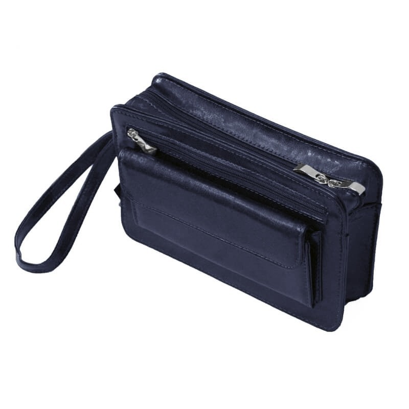 Elegancka saszetka męska wykonana ze skóry naturalnej w kolorze granatowym. W środku znajdują się jedna komora, w środku kieszeń zasuwana na suwak oraz dwie dodatkowe kieszenie na dokumenty, np paszport.
