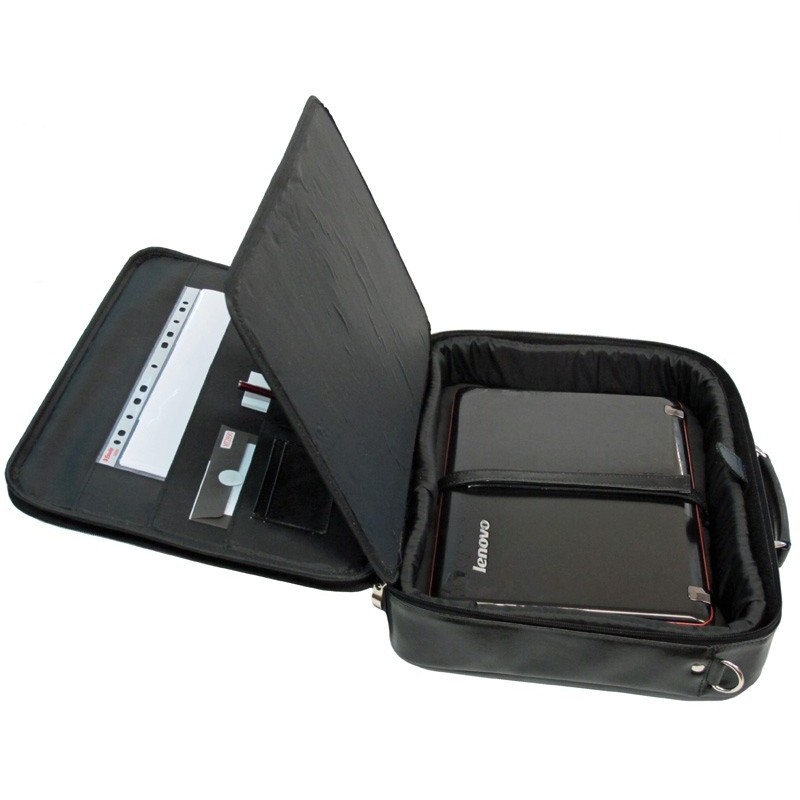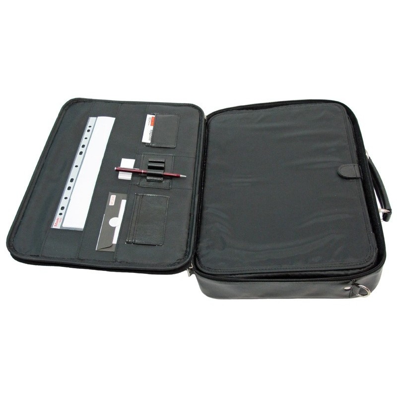 - Po drugiej stronie przegrody znajduje się tzw. mini biuro: dwie duże, płaskie kieszenie mieszczące dokumenty formatu A4, dwie kieszonki na płyty CD/DVD, cztery kieszenie na wizytówki, dwa miejsca na pióra lub długopisy